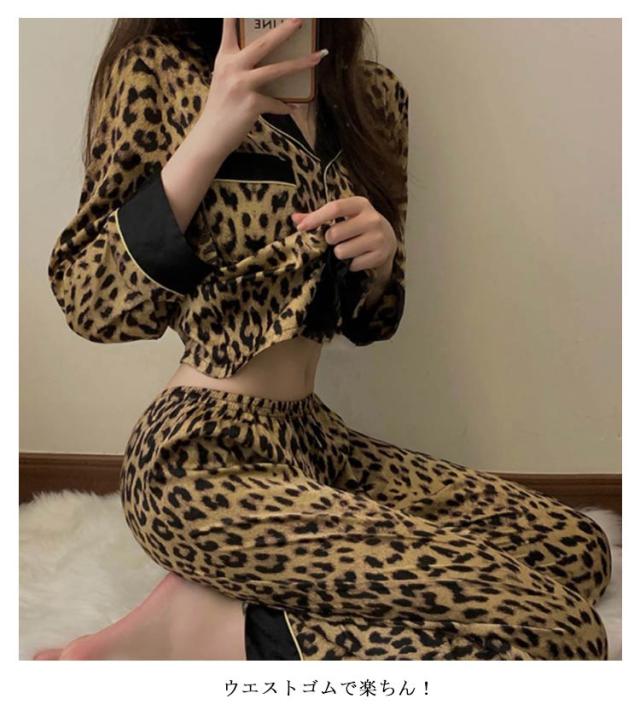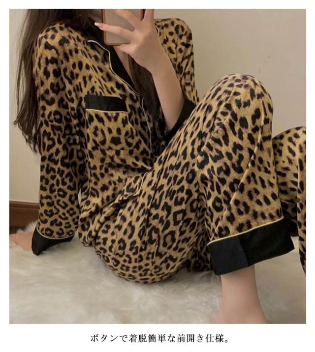 前開き 上下セット レディース 動物 部屋着 ルームウェア パジャマ 長袖 ヒョウ柄 女性用 パジャマ 襟付き ヒョウ柄 豹柄 レオパード アニマル ヒョウ柄 総柄 ウエストゴム 寝間着 秋 冬 春 夏