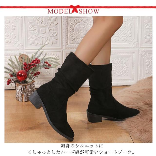 | 細身のシルエットにくしゅっとしたルーズ感が可愛いショートブーツ。 広めの履き口でゆったりラクに履けるのでヘビロテになること間違いなしの一足です! インヒール入りで美脚効果があるだけでなく、たくさん歩いても疲れない足元に。 普段使いやおでかけ、通勤、通学にもおすすめ | |