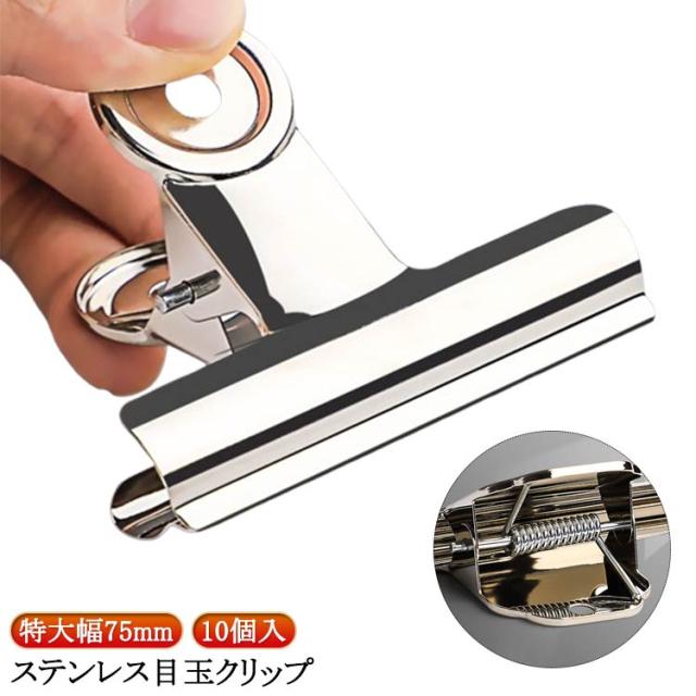 文具 文房具 10個入 密封クリップ ステンレス クリップ 幅75mm 目玉クリップ 錆ににくい 事務用品 オフィス 食品保存 業務用 学校 特大 袋止めクリップ ダブルクリップ 超強力