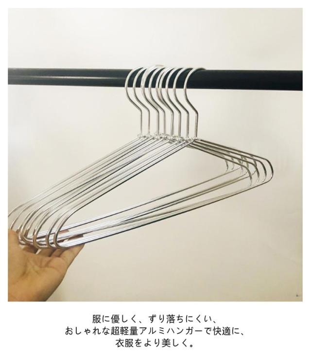 | アルミニウム製の軽くて錆びにくいハンガー30本セットです。【長さ42cm】 程よい光沢と洗練されたデザインが美しく、さっと服をかけるだけで、より一層衣服を引立てます。 肩先がゆるやかにカーブされたデザインで、衣服を引っ張ることがなく、型崩れや服を傷めにくい仕様となっておりますので、安心してお使いいただけます。 肩部分に深めの溝をつくり、キャミソールやタンクトップなどの衣服がずり落ちにくいのも嬉しいポイント♪ また、アルミ素材100%を使用したことで、重さわずか50gと超軽量を実現いたしました。 たくさんの衣服をまとめて収納する時や、クローゼットの中の衣服の並び替えの際もラクラク行っていただけます♪ 服に優しく、ずり落ちにくい、おしゃれな超軽量アルミハンガーで快適に、衣服をより美しく。 | |