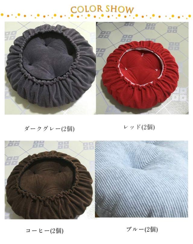 | 暖かい起毛生地を使用した丸椅子用座面カバー。【クッション厚さ約5cm】【ゴムフィットタイプ】 座面に被せるだけの手軽さでお尻の痛みを和らげられる。 中材には座り心地よい充填物(ポリエステル)を含んでいます。これにより、長時間座っても疲れにくい。 表生地は暖かいコーデュロイ生地を使用しております。 まわりにゴム入りでしっかりと丸椅子を固定できます。 椅子を汚れや擦り傷から保護するだけではなくて、木や金属の椅子を柔らかにさせます。 | |