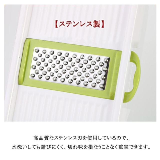 | 【8枚ブレード】 自由に付け替えが可能な8枚ブレード(1mmスライス、2mmスライス、3mmスライス、3mm千切り、4mm千切り、5.5mm千切り、ワッフルスライス用の飾り切り刃、おろし金)、中身を確認しやすい半透明で大容量のフードコンテナと、指のけがを防止する安全ホルダー、フードコンテナ底部に滑り止めも付いているためストレスなく料理に集中できます。 【お手入れも簡単】 ブレードの交換は、簡単で安全性の高いスライド式を採用。 【ステンレス製】 高品質なステンレス刃を使用しているので、水洗いしても錆びにくく、切れ味を損なうことなく重宝できます。 【ブレード収納ボックス付き】ブレード収納ボックス付きで、使用しないときはまとめてブレードを収納できます。 | |