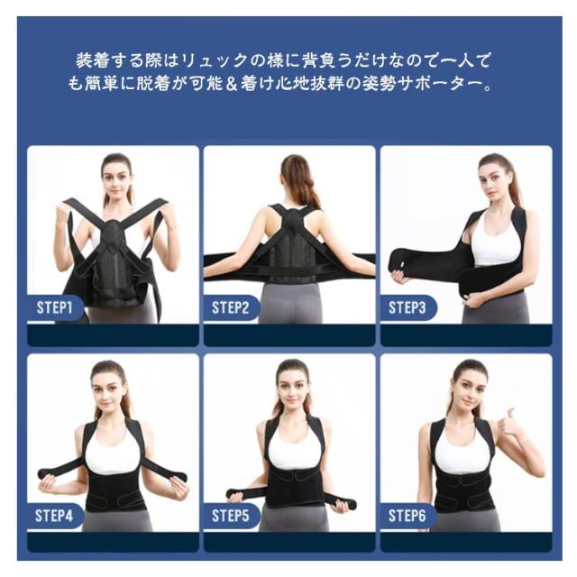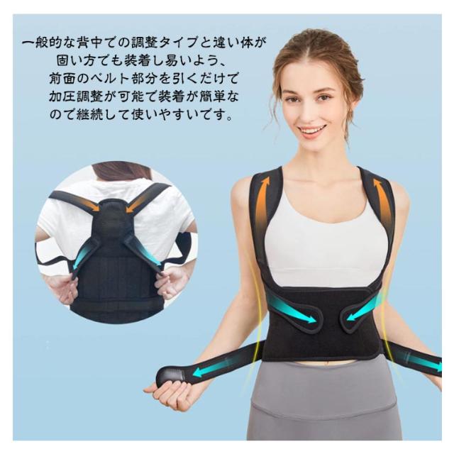 | 【美しい姿勢サポーター】【S M L】 装着する際はリュックの様に背負うだけなので一人でも簡単に脱着が可能&着け心地抜群の姿勢サポーター。 長時間の同じ姿勢や、間違った姿勢にならないように、着用するだけでサポートしてくれます。美しい姿勢の習慣化で理想の美しい姿勢を造る。 一般的な背中での調整タイプと違い体が固い方でも装着し易いよう、前面のベルト部分を引くだけで加圧調整が可能で装着が簡単なので継続して使いやすいです。 着用時にムレを大幅にカットする加工が施されており、長時間の装着も可能です。ソフトな素材を加工、皮膚に当たって痛くなったり脇に食い込んだりしづらく、快適にご使用して頂けます。 | |