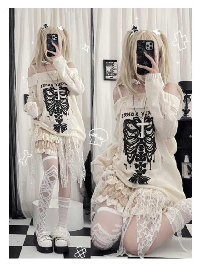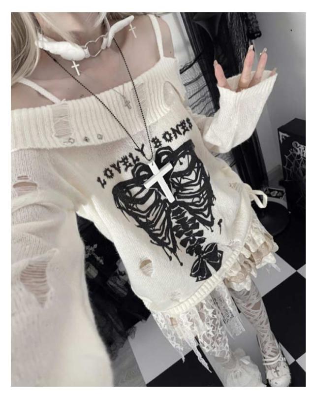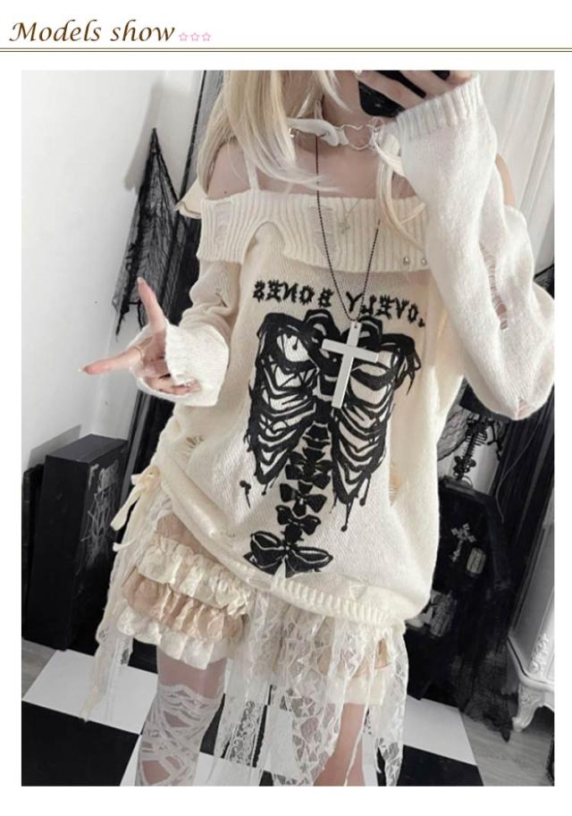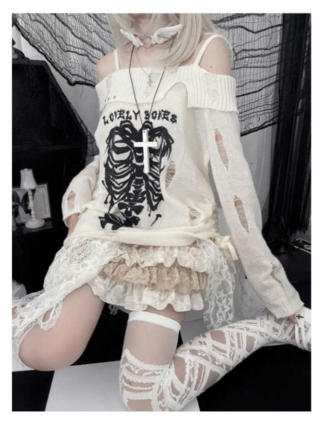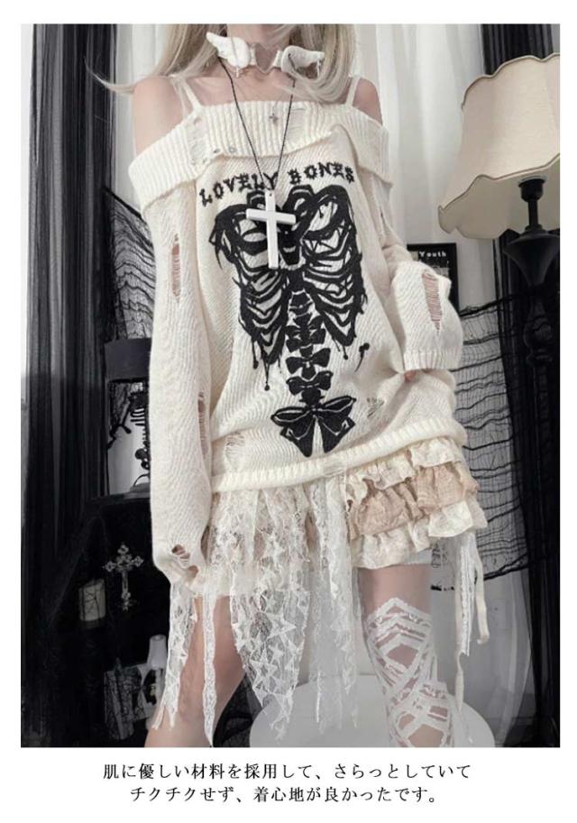 セーター オフショルダー 秋 レディース ダメージ加工 春 地雷系 ゴスロリ 肩出し 肩ベルト 服 量産型 おしゃれ カットソー フェミニン トップス 長袖 学生 着?せ パンク 原宿風 ニット 病みかわいい サブカル系 Y2K