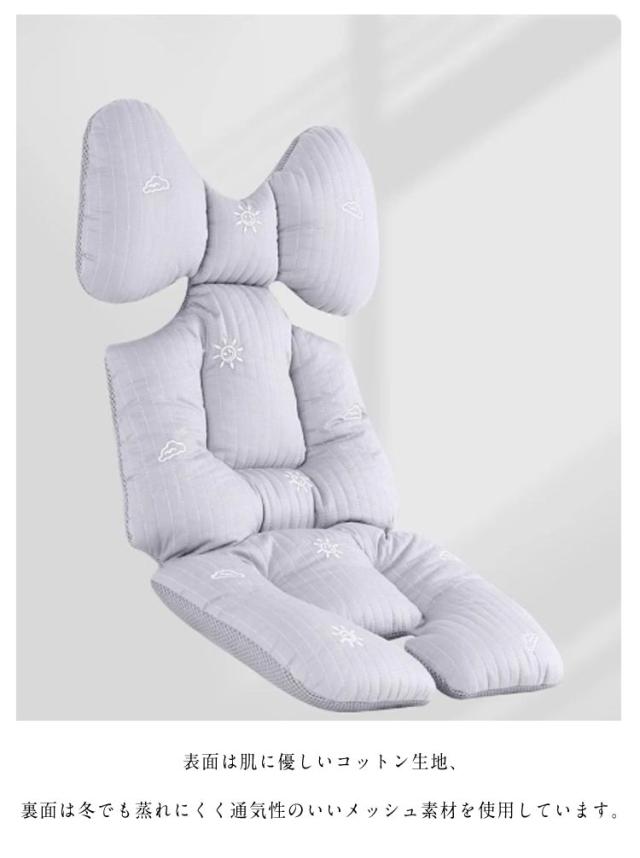 | かわいい刺繍デザインのコットン素材のベビーカー用クッション。 ベビーカー本体への汚れ防止にも、中綿入りのふんわりクッション。 表面は肌に優しいコットン生地、裏面は冬でも蒸れにくく通気性のいいメッシュ素材を使用しています。 ヘッドクッションの形は両サイドをやさしくガードするかわいい「リボン」型にしました 元となるベビーカーのシート自体にクッション性のあるものが多いので、そのまま乗せて使えるように約2〜3cm程度の厚みのクッションにしました。ベビーカーを折りたたんでも邪魔にならないちょうどいい厚み。お洗濯しても乾きやすいのもメリットですよね。 | |