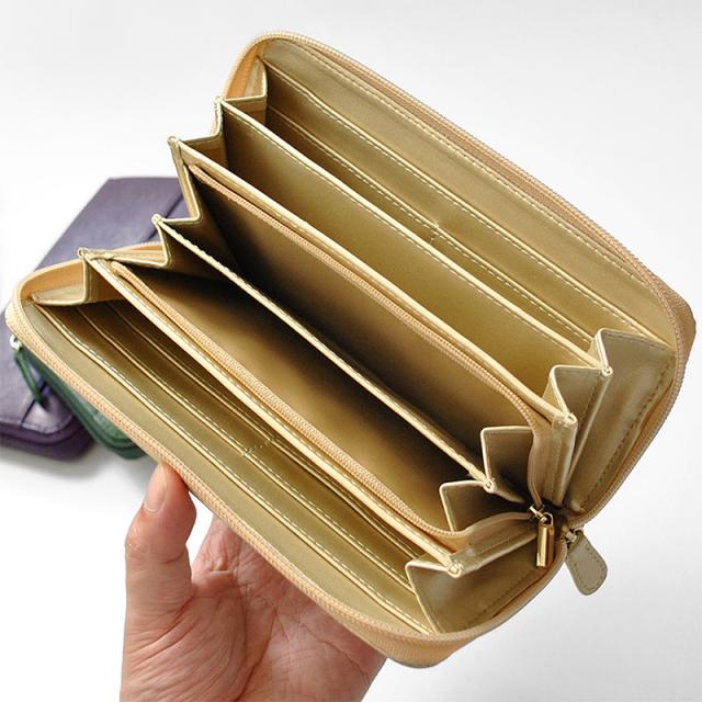 | 商品説明 | 華やかな柄の型押し牛革を使用した背面ポケット付きラウンド長財布です。 通帳やパスポートも収納可能な大容量デザインで中仕切りや フリーポケットも多いので実用性も充分です。 カラーはシャンパンゴールド、パープル、グリーンの厳選された 人気の3色をご用意。 |