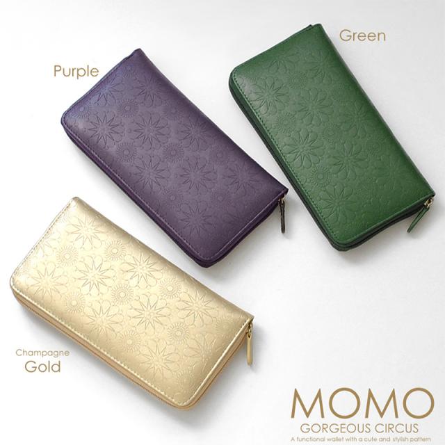 MOMO 牛革 長財布 レディース 財布 型押し ラウンドファスナー 背面ポケット付き
