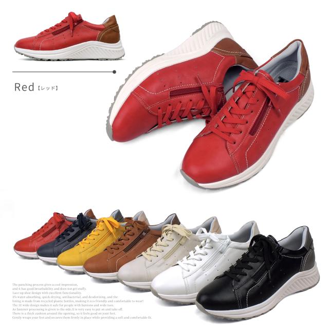 WILSON LEE SPORTS-ウィルソンリースポーツ-足にやさしく(SOFT&FIT)がコンセプト涼し気な印象のパンチング加工で通気性も良く蒸れにくい、機能性にも優れたレースアップスニーカー。吸水速乾&抗菌防臭効果があるペットボトルのリサイクル糸をライニングに使用したエコなのに快適な履き心地。3Eの幅広設計で外反母趾や幅広の方でも安心してお履き頂けます。サイドファスナー付きで脱ぎ履きも楽々。履き口周りには厚みのあるクッションが入っており、足あたりが良く足を優しく包み込み、しっかり固定しながらもソフトなな履き心地を実感できます。多彩なカラーバリエーションも魅力。