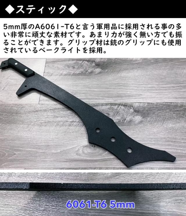 | サイズ | ・盾(A6061-T6 厚3mm/グリップ部:ベークライト)縦65cm×横29cm,重量約1.6kg ・スティック(A6061-T6 厚5mm)長さ65cm,重量約0.49kg |