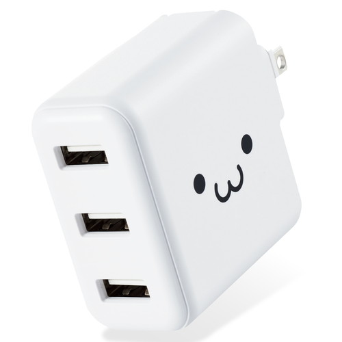 家庭用コンセントからスマートフォンやタブレット等を充電、給電できるAC充電器です。出力端子が3ポートありますので、スマートフォンなどを3台同時に充電が可能です。1ポート最大出力12W(5V/2.4A)、合計最大出力18W(5V/3.6A)の高出力タイプです。※全ポート合計の電流値を超えた場合、保護回路が動作しすべての端子で充電できなくなる場合があります。接続された機器を自動検知し、最速電流で充電できるおまかせ充電に対応しています。スマートフォン等に付属もしくは対応する充電用USBケーブルを使用して充電可能です。※本製品に充電用ケーブルは付属していません。未使用時は電源プラグを折りたたんで充電器本体に収納可能です。スッキリとコンパクトに収納できるので、持ち運びにも便利です。トラッキング現象による火災の防止に役立つ、絶縁キャップ付きのコンセントプラグを採用しています。※端末本体や充電器が濡れた状態で充電すると、異常な発熱・焼損の原因となり大変危険ですのでおやめください。