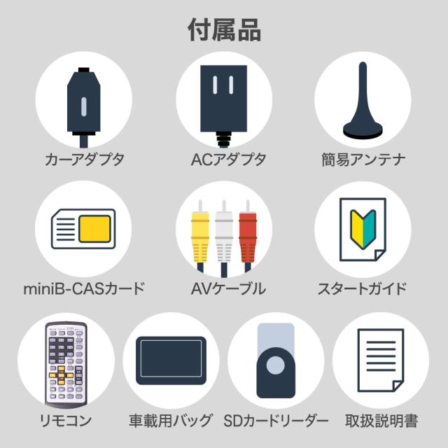 リモコン ( テスト用電池含む )、AC アダプター、カーアダプター、AV ケーブル (RCA)、ワンセグ用簡易アンテナ、車載用バッグ、miniB-CAS カード、スタートガイド、取扱説明書 ( 保証書添付 )