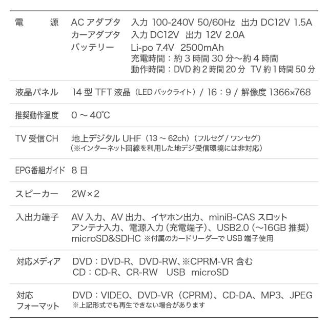 入力:電源入力(充電端子)、 AV、USB2.0、アンテナ、mini B-CAS カード 出力 : イヤホン、AV