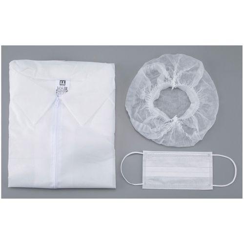 使いきりの不織布白衣・マスク・ヘアキャップの3点セットです。来訪者用に適したウェアセット 使いきりの不織布白衣・マスク・ヘアキャップの3点セットです。来訪者用に適したウェアセット。