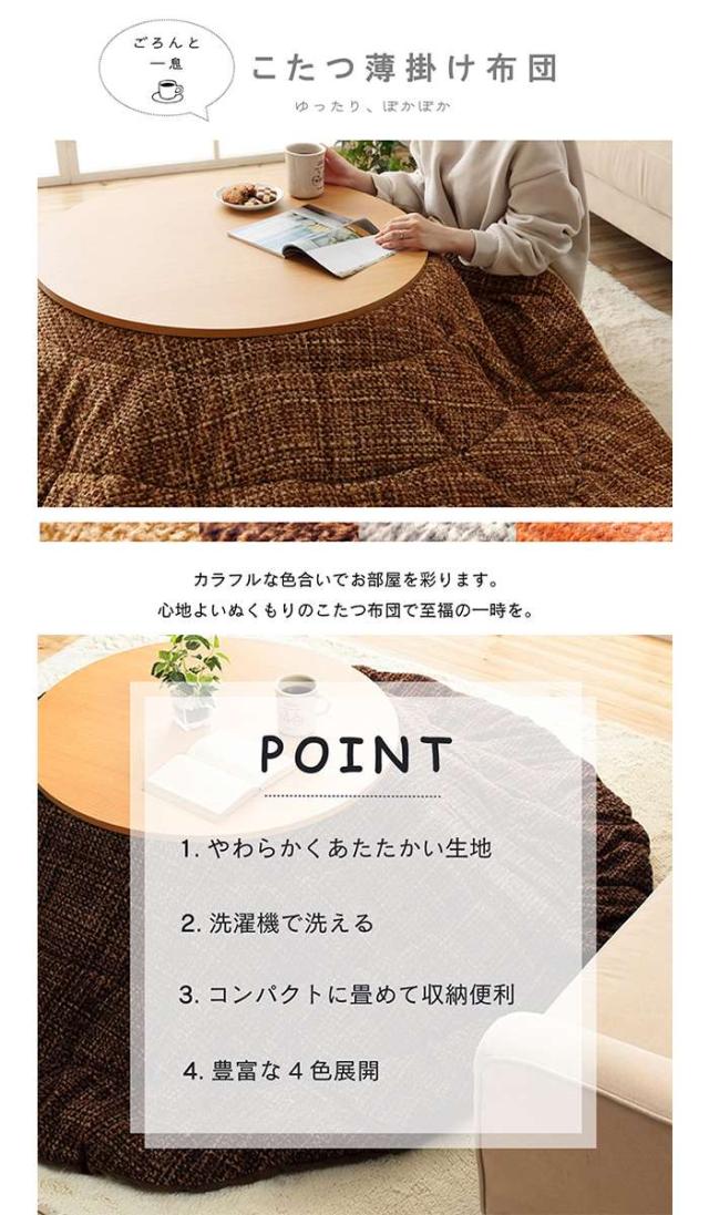 こたつ掛布団。185x225cm。カラーは、ブラウン(4550317200489:1181770067011)、ベージュ(4550317200441:1181770027011)、グレー(4550317200526:1181770137011)、オレンジ(4550317200564:1181770207011)、です。あたたかみのあるカラーを使用したこたつ布団です。表地は凸凹感を持たせボコボコとしたタッチ感が特徴です。裏地にはなめらかな肌触りのフランネルを使用しています。薄手なので折りたたんでもかさばらず、コンパクトに収納できます。こたつの特徴として、1.省エネルギーこたつは必要なところだけを暖める省エネルギー暖房器具です。2.クリーンこたつは二酸化炭素など有害物質を出さないのでクリーンです。3.団らんの場家族や友達が一緒にくつろげる空間、心もポッカポカになります。※ ふとんをやぐらの中に押し込んだり、座イスやイス全体をこたつの中に入れたまま使用しないでください。ふとんがヒーターに当たらないようにご使用ください。(火災の原因になります)ご使用により、ふとんが焦げた場合につきましては、返品・交換を承ることができませんので、あらかじめご了承ください。
