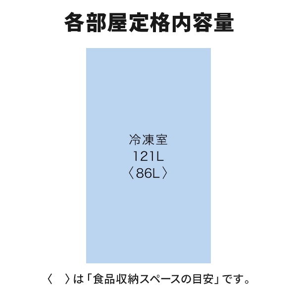 コンパクトで大容量。しかも省エネ。運転音が静かで響きにくい。 ■定格内容積:121L[86L] ※[ ]内の数字は食品収納スペースの目安 ■外形寸法:幅480×奥行586×高さ1,126mm ■必要設置スペース:幅520×奥行633×高さ1,226mm ※設置条件により若干異なることがありますので、10mm程度余裕をとってください。 ■冷却方式:ファン式(霜取り・自動) ■質量(約):31kg ■年間消費電力量(50/60Hz):360kWh/年 ※記載は商品仕様の一部です。仕様説明不足等の理由での返品はできません。特に適合等は必ずご確認ください。