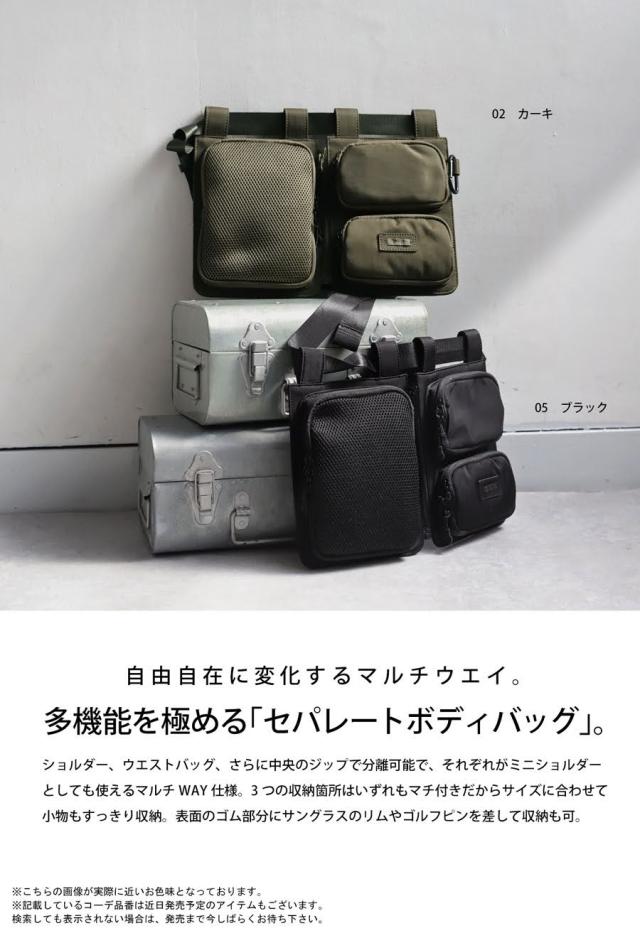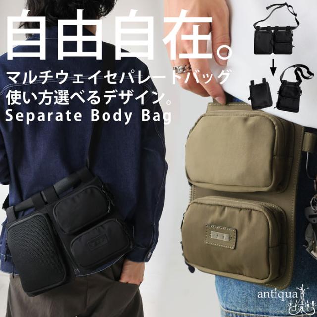 【検索ワード】セパレートボディバッグ バッグ メンズ 鞄 ショルダーバッグ ショルダー 肩掛け ななめ掛け ウエストバッグ 多機能 機能性 ファスナー ジッパー メッシュ ナイロン生地 コードチップ カラビナ ゴルフピン 軽量 マチあり シンプル 内ポケット ウェットスーツ スポーティー ミニショルダー マルチway コードチップ カラビナ クッション素材 ソフト 柔らかい 丈夫 汚れにくい 肩紐調節可 マット カーキ ブラック 黒 ユニセックス 男性 男 かっこいい カッコイイ カジュアル antiqua treecafe アンティカ ツリーカフェ メンズファッション トレンド コーディネート 通販 ブランド 春 夏 秋 冬 オールシーズン あんてぃか