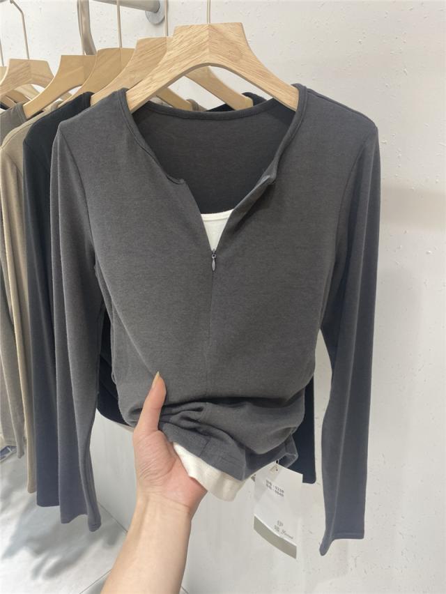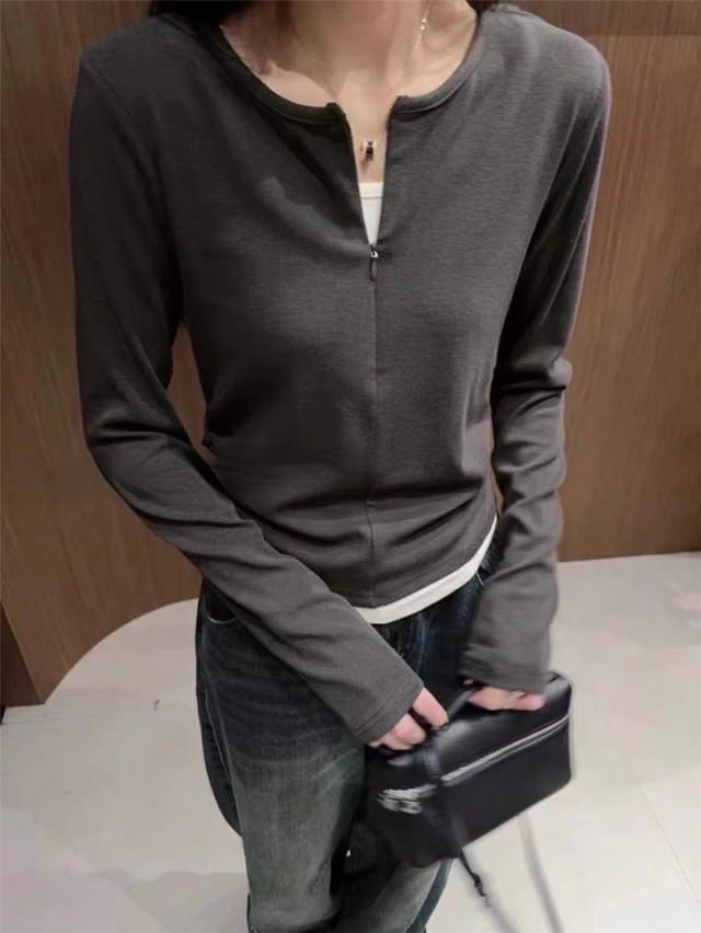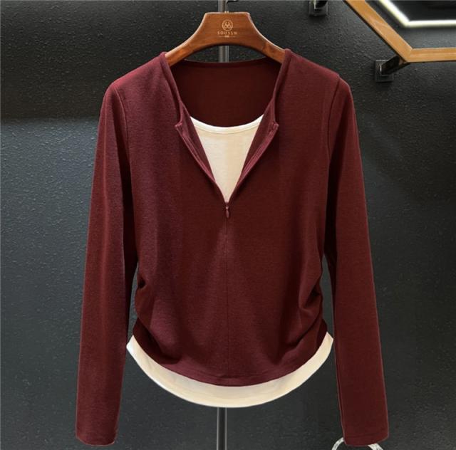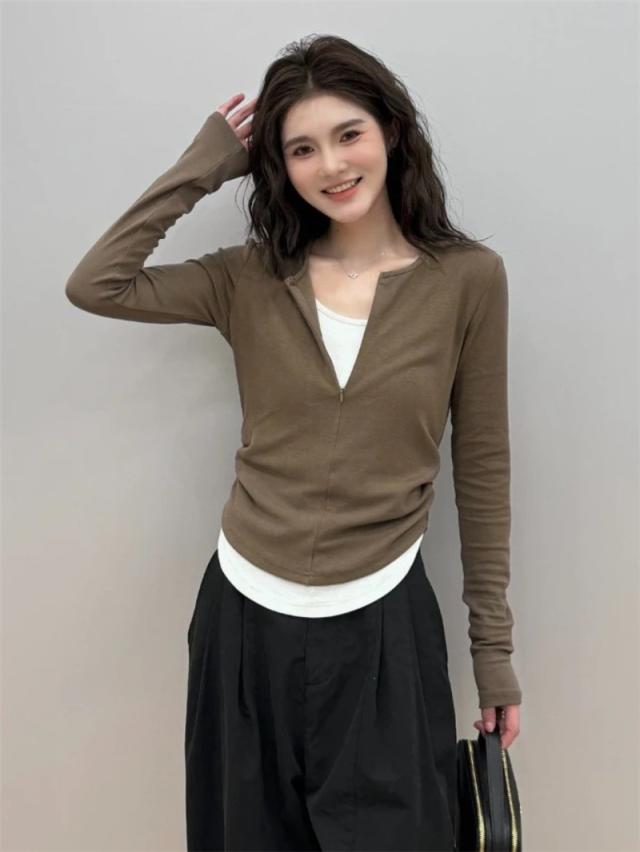 Tシャツ レディース 長袖 トップス tシャツ カットソー 重ね着 クルーネック フェイクレイヤード カジュアル おしゃれ 着痩せ