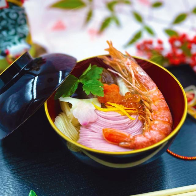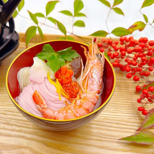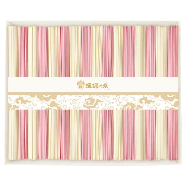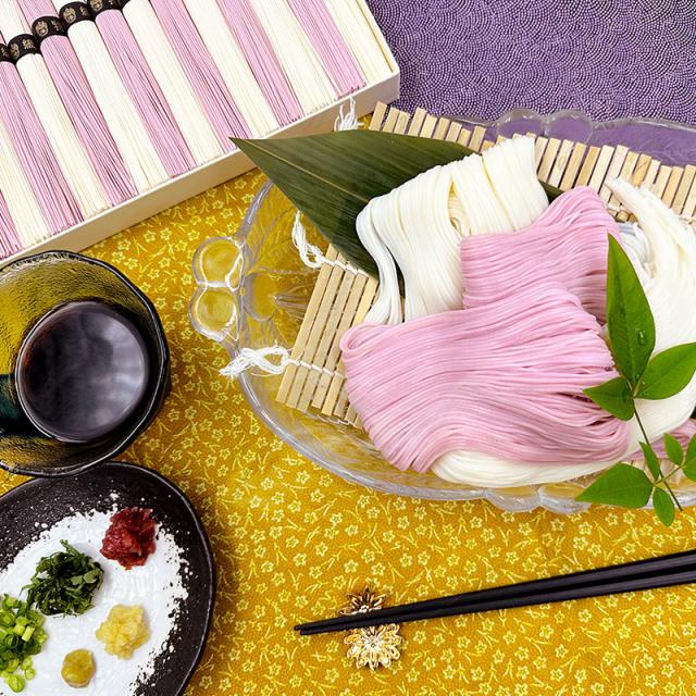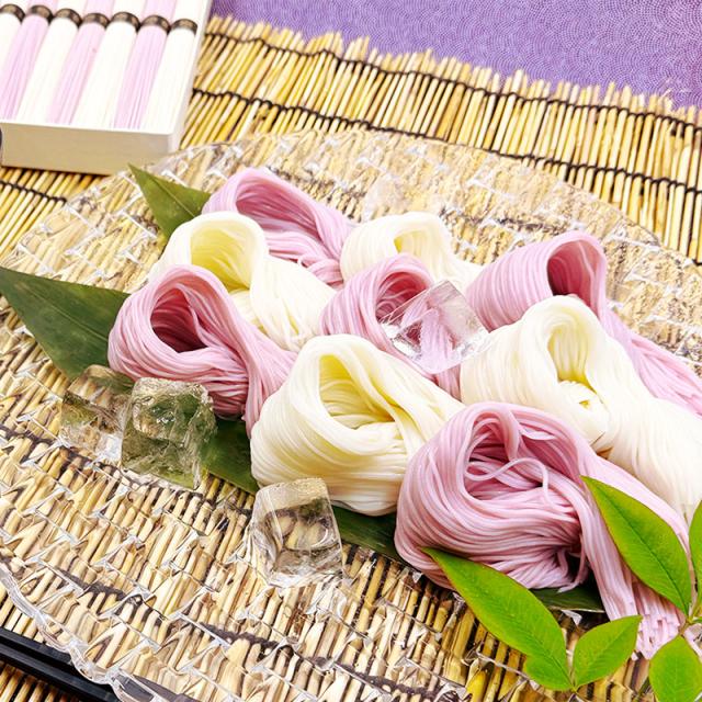 紙箱入り。上質の原料を使用して厳冬期につくられる高級素麺。色麺は天然色素のみ使用しております。