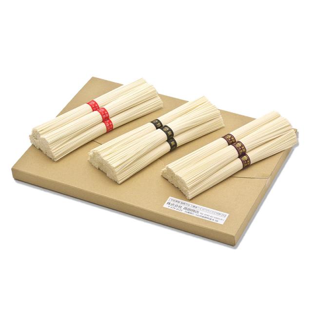 紙箱入り。上級品、特級品、縒つむぎ、3種類の手延素麺を食べ比べてください。