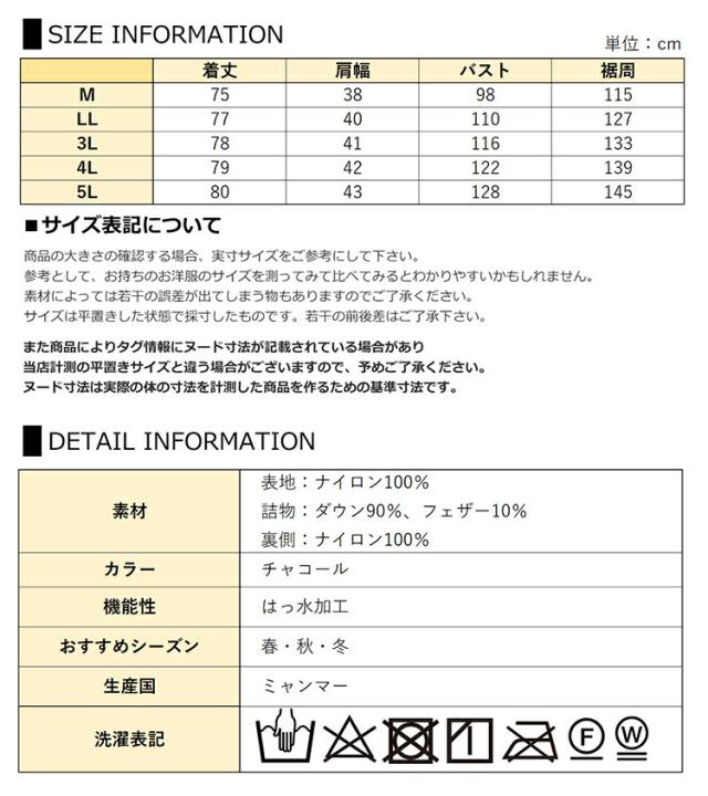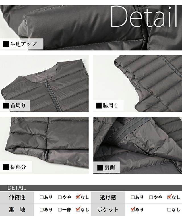 | 素材 | 表側:ナイロン100% 詰物:ダウン90%、フェザー10% 裏側:ナイロン100% |