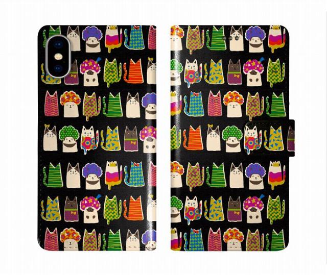 スカラー scolar AQUOS SH-53E/SHG14 ケース 手帳型 アクオス AQUOS wish3 SH-53D/A302SH SH-51C SH-54B SH-53A スマホケース スマホカバー 手帳 全機種対応 ネコいっぱい 猫柄 アフロ猫と仲間 ブラック