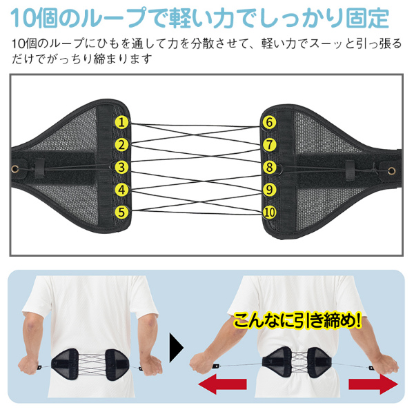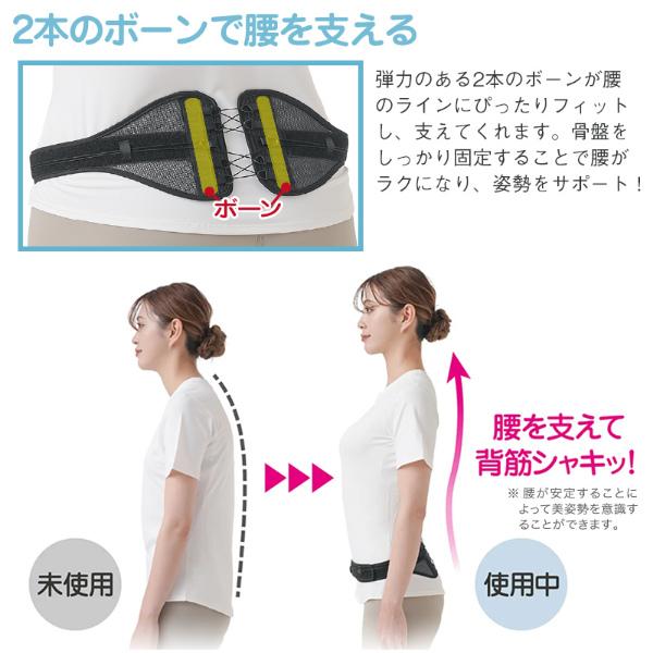腰を支えて背筋シャキッ!薄いのに強力なサポート力。■力の偏りを抑えた独自の編み上げ構造!軽い力でスーッと引っ張れば、ギューッと締まって腰を安定!■2本のボーンで腰をしっかり支える!柔道整復師監修の腰ベルト!■メッシュ生地で蒸れにくい!薄型・軽量でアウターの下に着ても目立ちにくいから普段使いに便利!普段から巻いておくことで、腰まわりの筋肉や骨をしっかりとサポートし負担を軽減してくれます。腰や骨盤が安定することによって美姿勢を意識することができます。厚みはたったの約5mm!薄型だからこそ装着も簡単、アウターにも響きにくいので、ジャケットの下などに、こっそり着用することもできます。風通しが良く、蒸れにくいメッシュ生地を使っているので、ゴルフなどのスポーツやアウトドアを楽しむときにも快適にご使用頂けます。