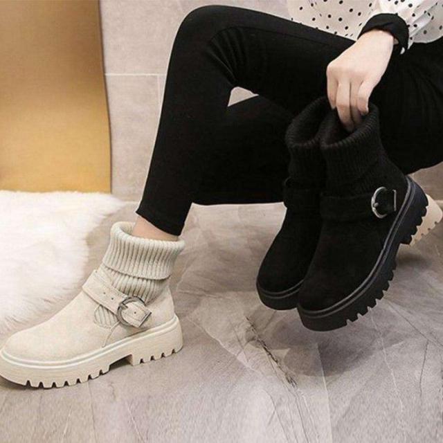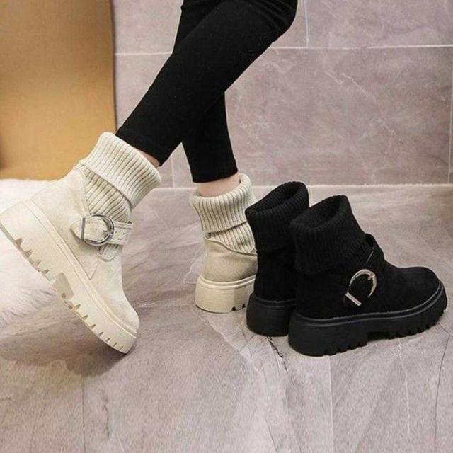 ソックス風 ショートブーツ レディース 2wayニットブーツ バックルベルト 厚底ブーツ 歩きやすい ハイカット ブーツ おしゃれ