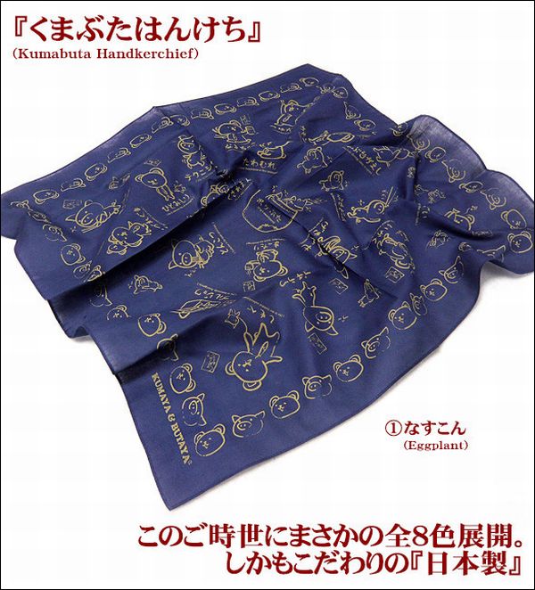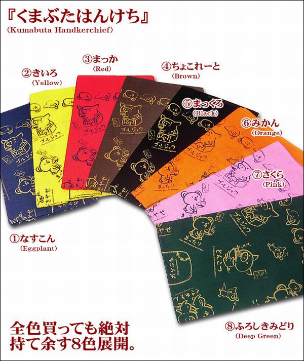 ☆くまや&ぶたやのキャラクターが総柄になった全8色展開の日本製はんけち。