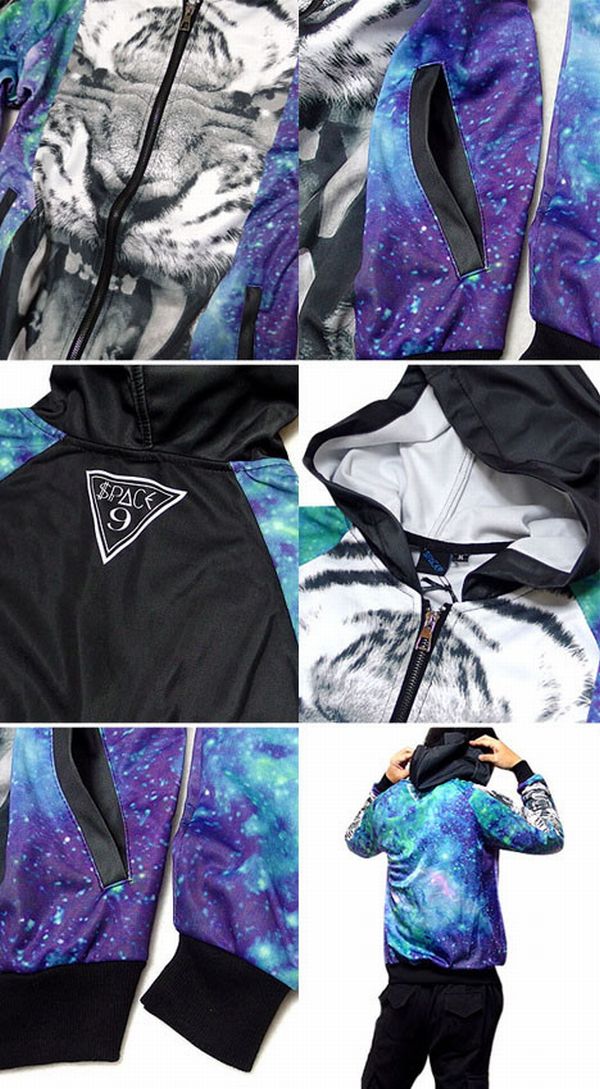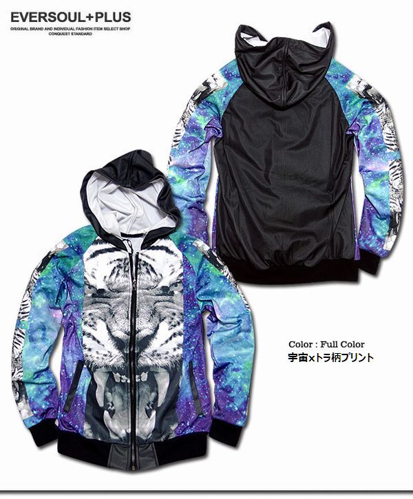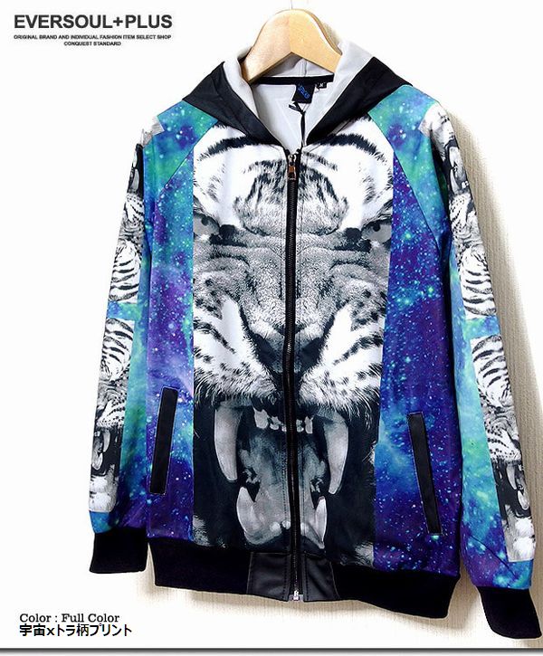 パーカー トップス メンズファッション 宇宙総柄 迫力ある トラの顔 切り替え 注目度抜群 フルカラージップパーカー カラフル 宇宙 【送料無料】