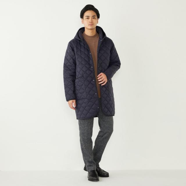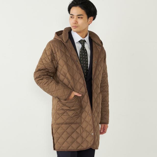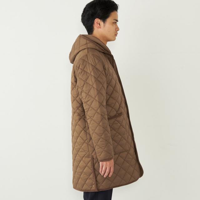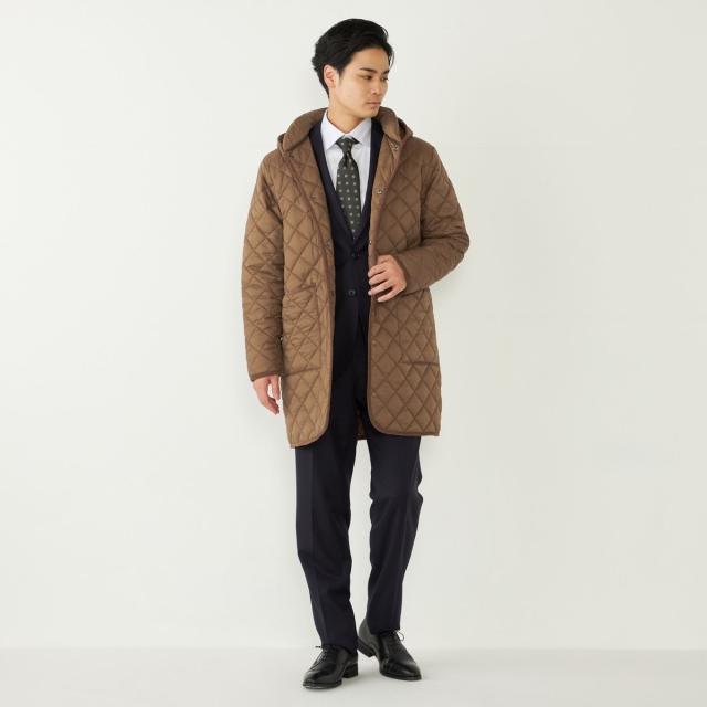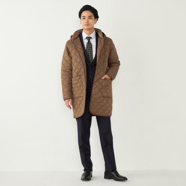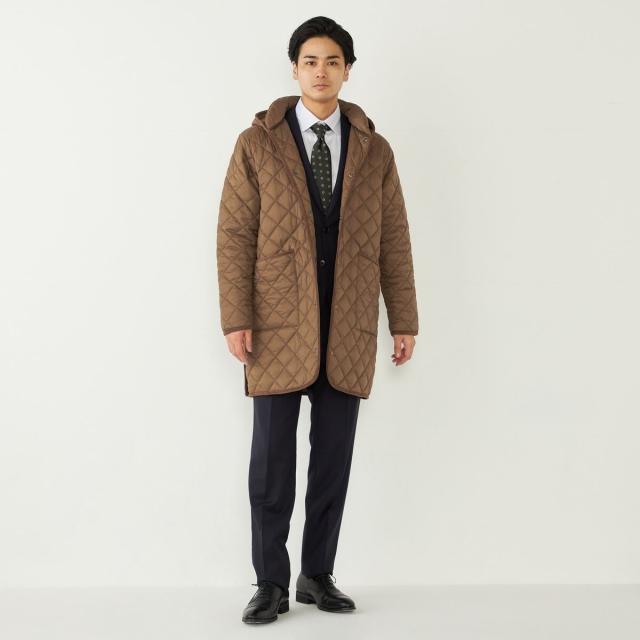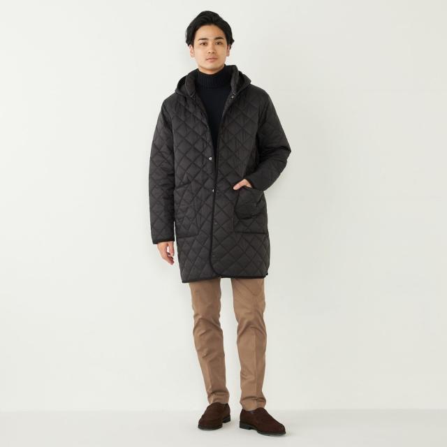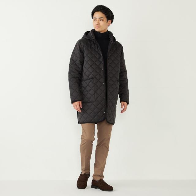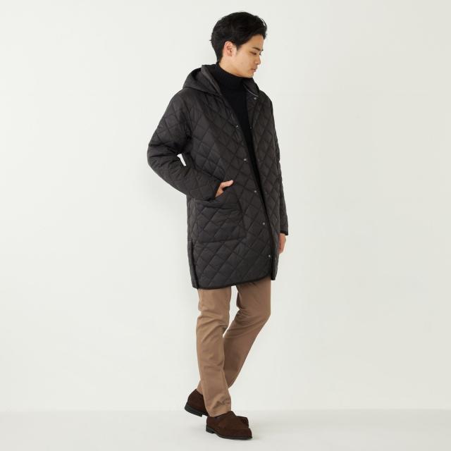 ビジネスにも対応可能なフード付きのキルティングコート。