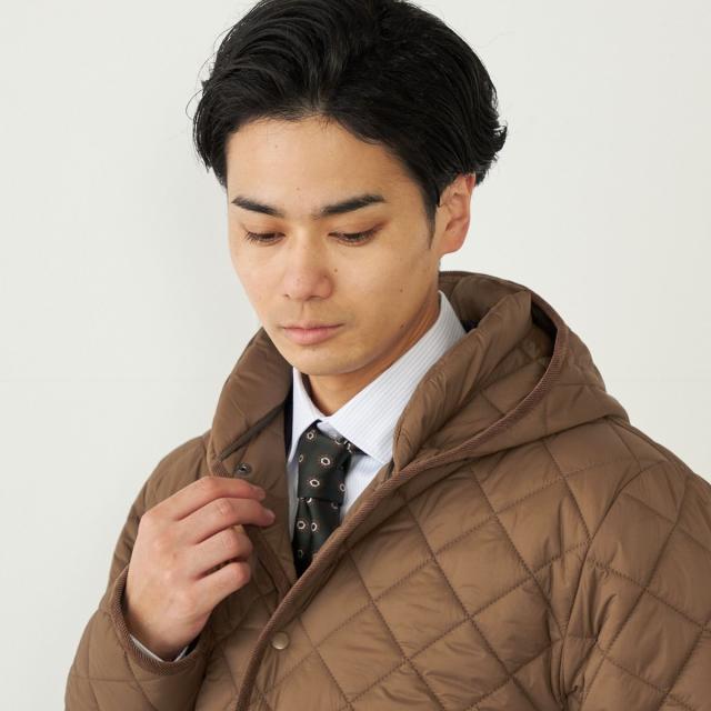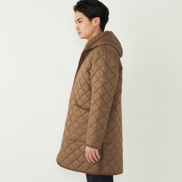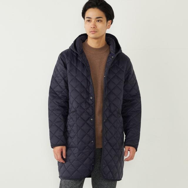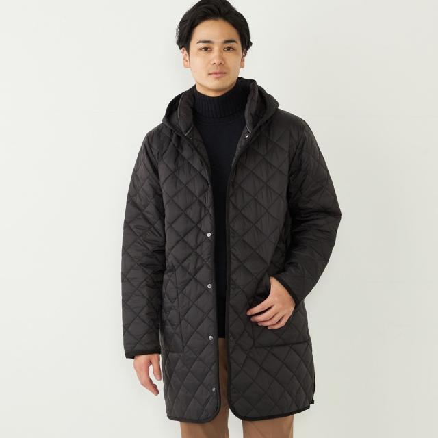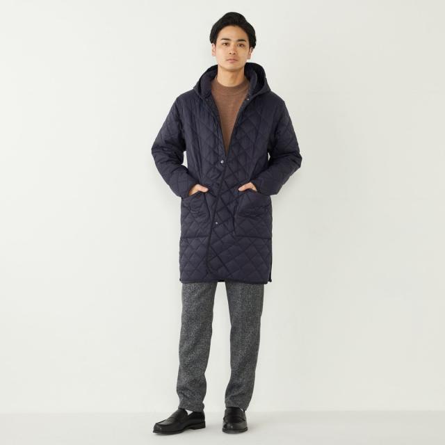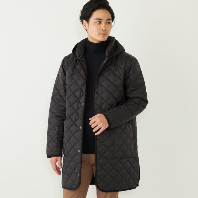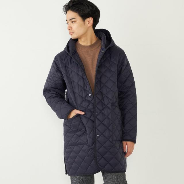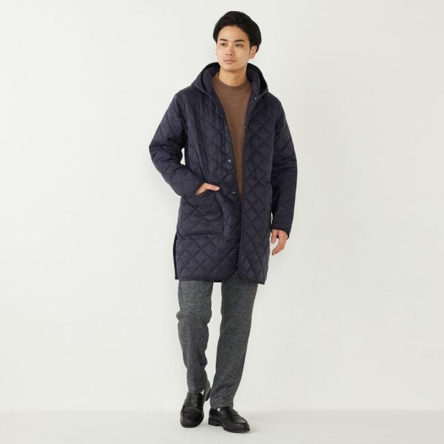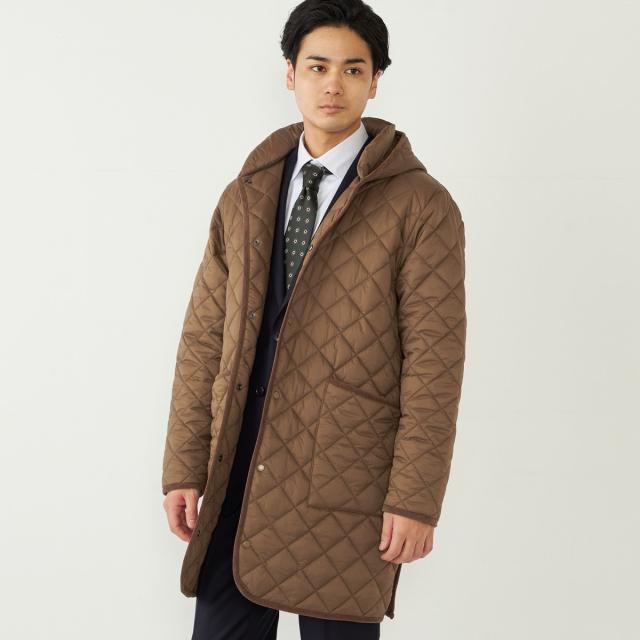 ビジネスにも対応可能なフード付きのキルティングコート。