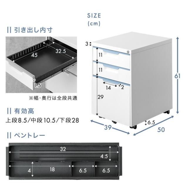 デスクワゴン 3段 キャスター付き 完成品 鍵付き 全段 フルオープン サイドワゴン オフィスワゴン 収納ワゴン A4 ファイルワゴン 大容量 収納 ワゴン 脇机 引き出し ペントレー シリンダー錠 オールロック スチール オフィス