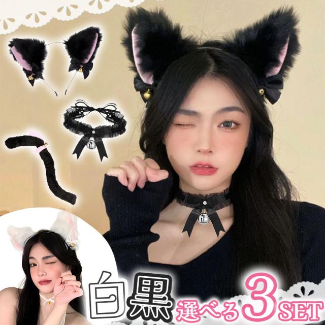 白・黒選べる コスプレ 3点セット 衣装 猫 大人 子ども ハロウィン 仮装 コス ねこ 猫耳 カチューシャ チョーカー 首輪 しっぽ 尻尾 かわいい 可愛い セット ふわふわ フリル 全身 一式 ブラック ホワイト ネコ キッズ 子供 簡単 宅コス 自宅 簡易 こどもコスチューム