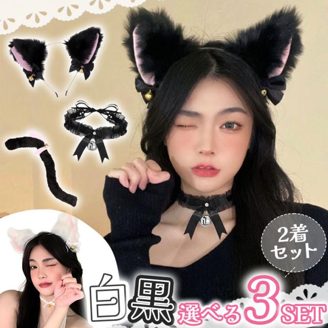 猫耳カチューシャ、チョーカー、しっぽの便利な3点セットで、誰でも簡単に仮装ができます。