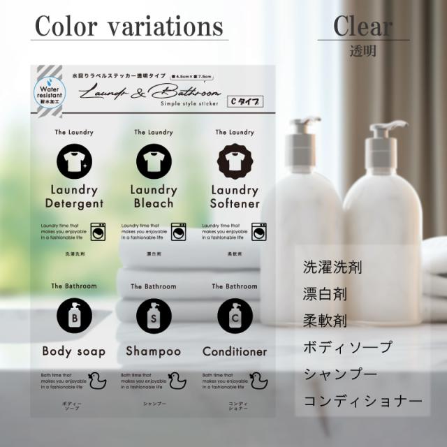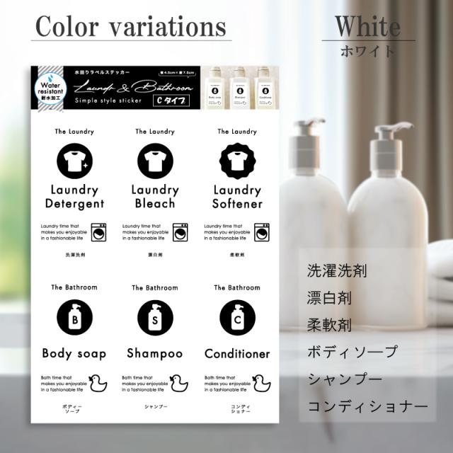 Laundry&Bathroomラベル Cタイプ 耐水 防水 シール おしゃれな詰替えボトル用ラベルシール ステッカー 生活雑貨 ランドリー シャンプー コンディショナー ハンドソープ 洗剤 ボディソープ 柔軟剤 洗濯洗剤 かわいい おしゃれ おしゃれ モノトーン