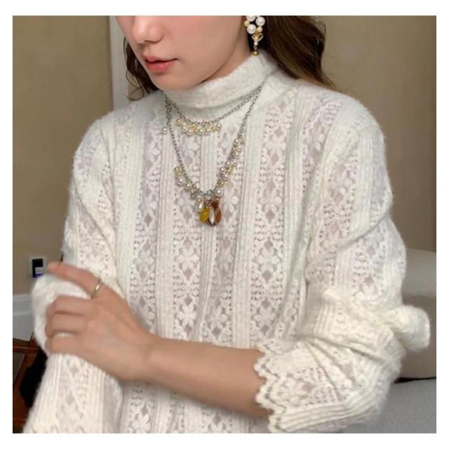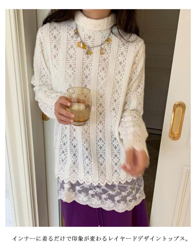 裾レース レースインナー トップス レディース 長袖 Tシャツ カットソー 裾 レース 付け裾 レーストップス レイヤード 重ね着風 シアートップス インナー シアー シースルー ハイネック プルオーバー ゆったり 透け きれいめ 春 秋 冬