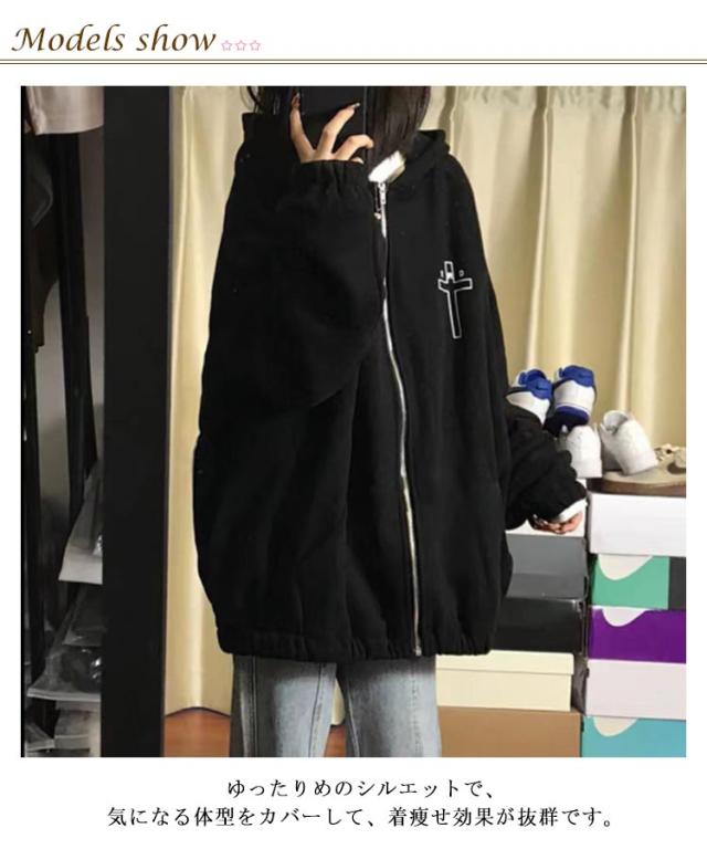 地雷系 パーカー レディース クロス 十字架 病みかわいい サブカル系 フード付き 長袖 ジップアップ トップス アウター オーバーサイズ ビックシルエット メンズ 男女兼用 原宿系 ストリート系 カジュアル トップス ギャル 服 おしゃれ ビッグパーカー