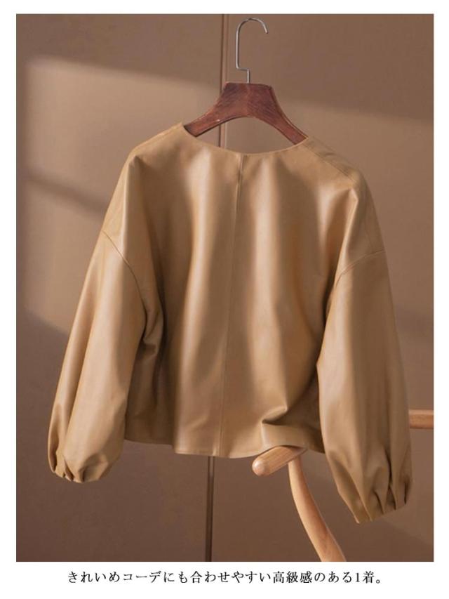 ノーカラー レザージャケット レディース フェイクレザージャケット ジャケット ノーカラージャケット 春秋 バルーン袖 大人女性 合皮 アウター ジャケット ショート 革ジャケット ジャケット ライダース ジャケット 通勤 OL 無地 シンプル 大人可愛い ギフト 送料無料