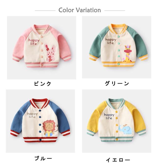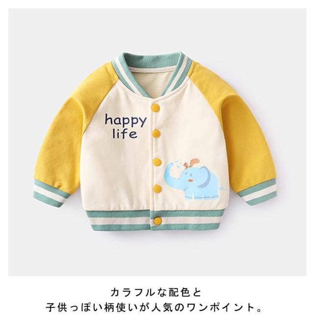 | シンプルかわいいキッズスタジャン。 カラフルな配色と子供っぽい柄使いが人気のワンポイント。 柔らかく肌に優しい素材でストレスフリー。 73cm-110cmサイズ揃い、普段着からはもちろん、お出かけ、通園などのシーンにも大活躍。 | |