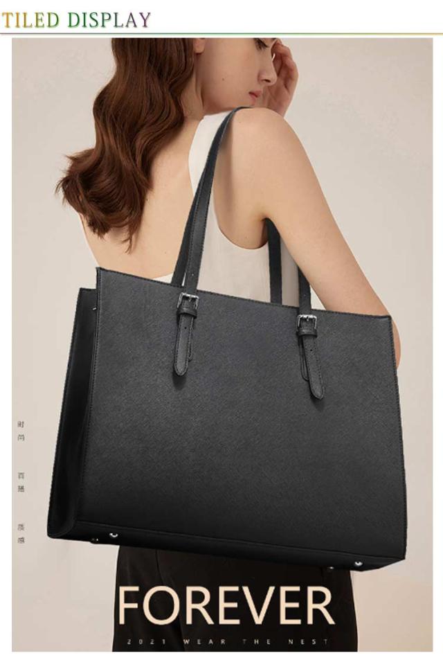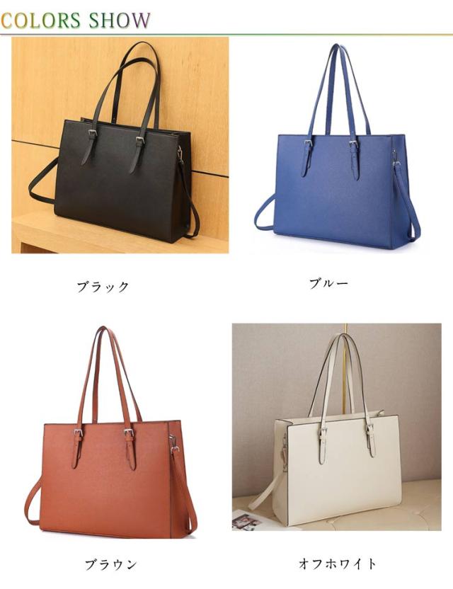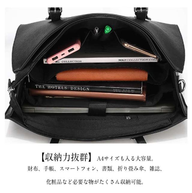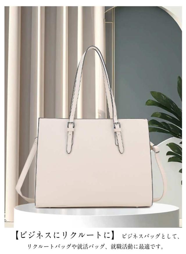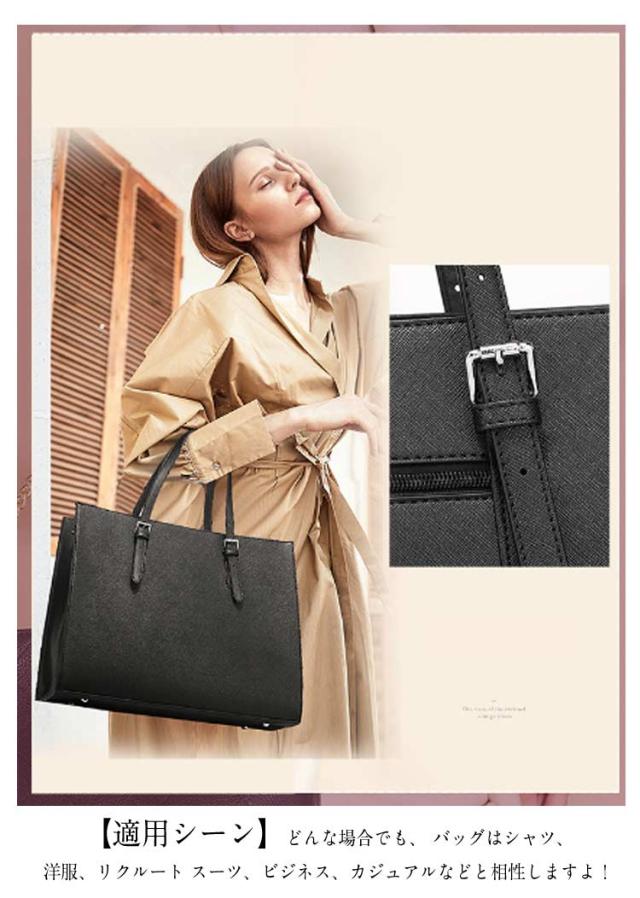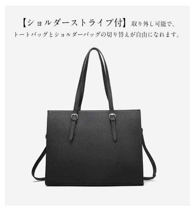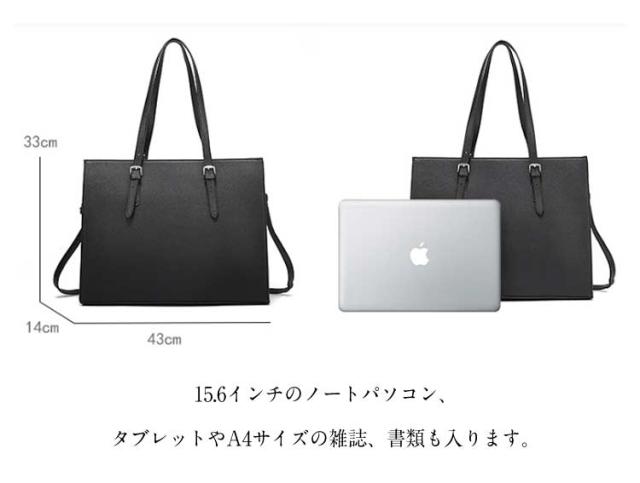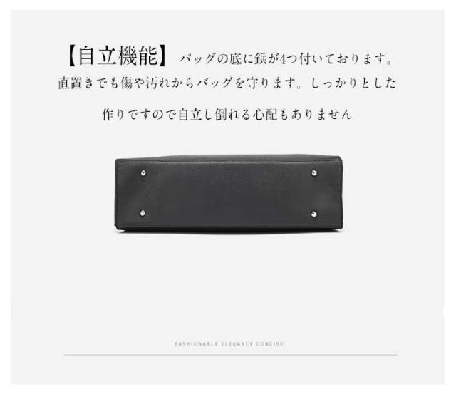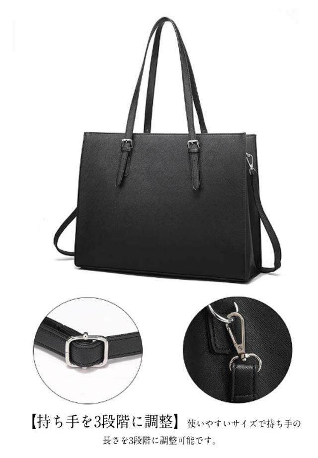 | リクルートに最適!機能的にもデザイン的にも優れたビジネスバッグ。 【ビジネスにリクルートに】 ビジネスバッグとして、リクルートバッグや就活バッグ、就職活動に最適です。 【自立機能】バッグの底に鋲が4つ付いております。直置きでも傷や汚れからバッグを守ります。しっかりとした作りですので自立し倒れる心配もありません 【収納力抜群】A4サイズも入る大容量。財布、手帳、スマートフォン、書類、折り畳み傘、雑誌、化粧品など必要な物がたくさん収納可能。15.6インチのノートパソコン、タブレットやA4サイズの雑誌、書類も入ります。 【ショルダーストライプ付】取り外し可能で、トートバッグとショルダーバッグの切り替えが自由になれます。 【持ち手を3段階に調整】使いやすいサイズで持ち手の長さを3段階に調整可能です。 【防水性】生地は防水PUレザー生地を使用しており、外出時に雨が降っていたとしても、中の資料が濡れる心配は要りません。 【適用シーン】どんな場合でも、 バッグはシャツ、洋服、リクルート スーツ、ビジネス、カジュアルなどと相性しますよ! | |
