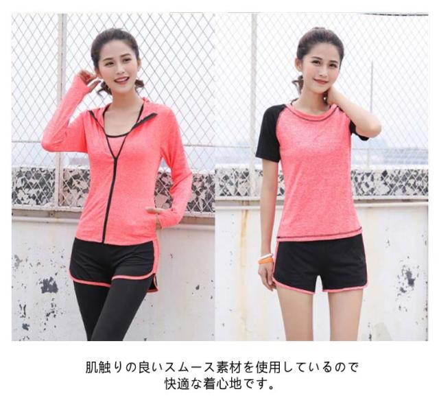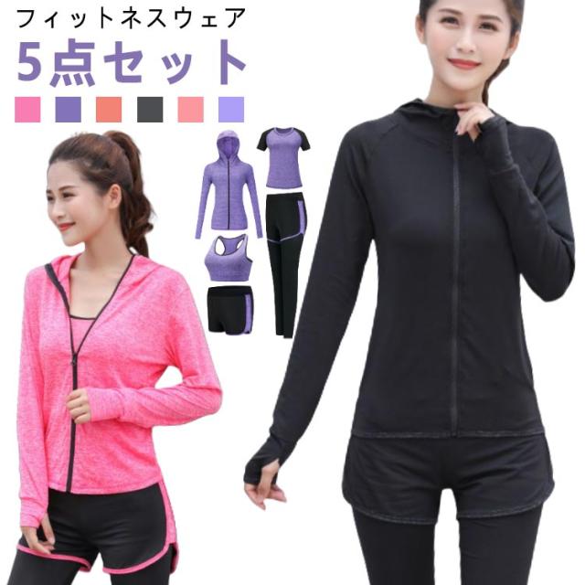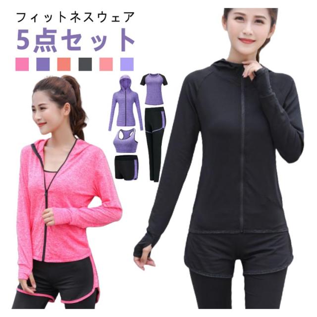 セットアップ レディース 上下 フィットネスウェア スポーツウェア ランニングウェア ヨガウェア 5点セット ジムウェア ウォーキング ウェア 半袖 トップス 長袖 パーカー パンツ 上下セット トレーニングウェア 配色 おしゃれ