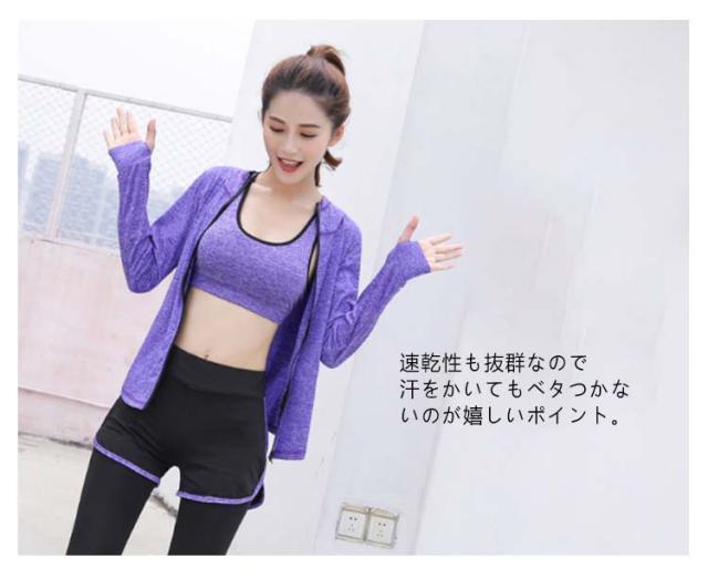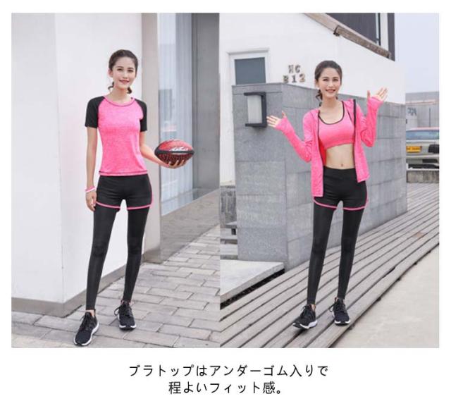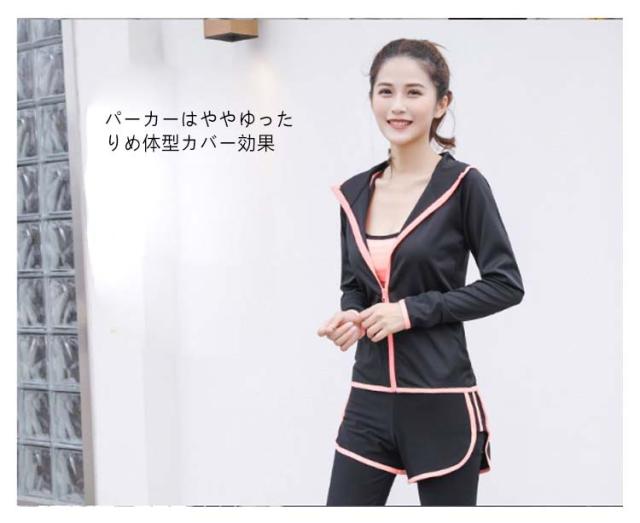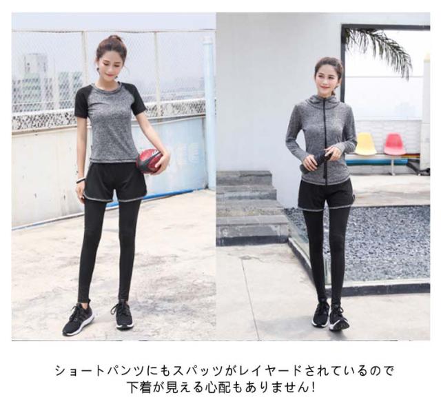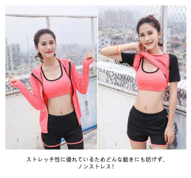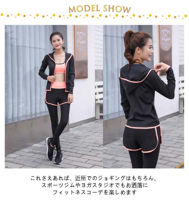 | フィットネスウェア5点セット これさえあれば、近所でのジョギングはもちろん、スポーツジムやヨガスタジオでもお洒落にフィットネスコーデを楽しめます♪ ブラトップはアンダーゴム入りで程よいフィット感。 パーカーはややゆったりめ体型カバー効果◎ レギンスパンツは日焼け防止や肌の露出を控えたい方におすすめです。 ショートパンツにもスパッツがレイヤードされているので下着が見える心配もありません! 肌触りの良いスムース素材を使用しているので快適な着心地です。 ストレッチ性に優れているためどんな動きにも妨げず、ノンストレス! 速乾性も抜群なので汗をかいてもベタつかないのが嬉しいポイント。 | |