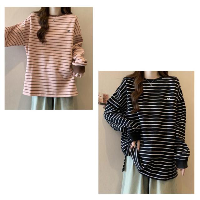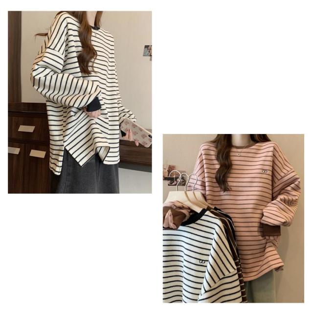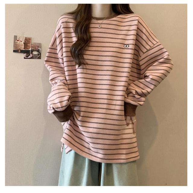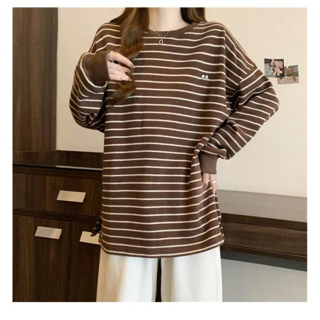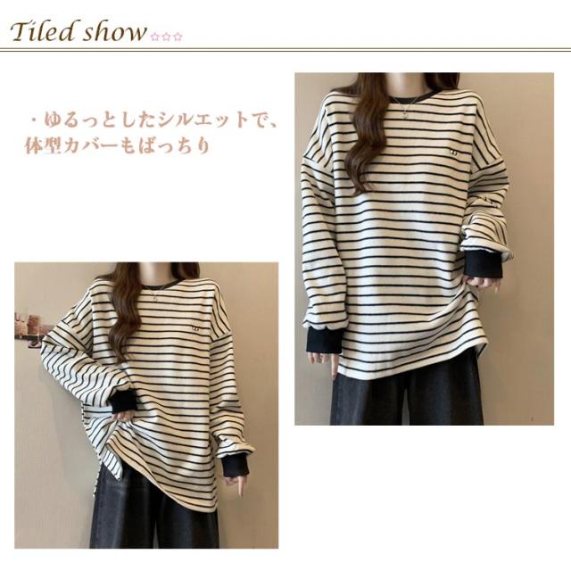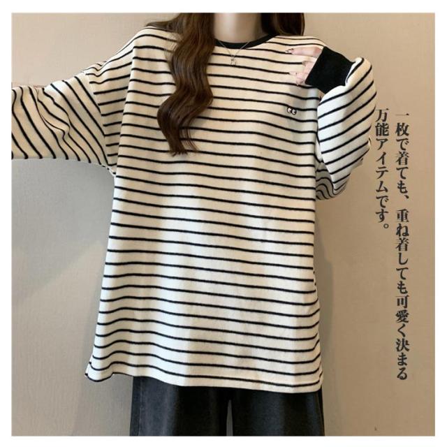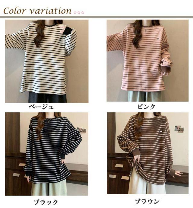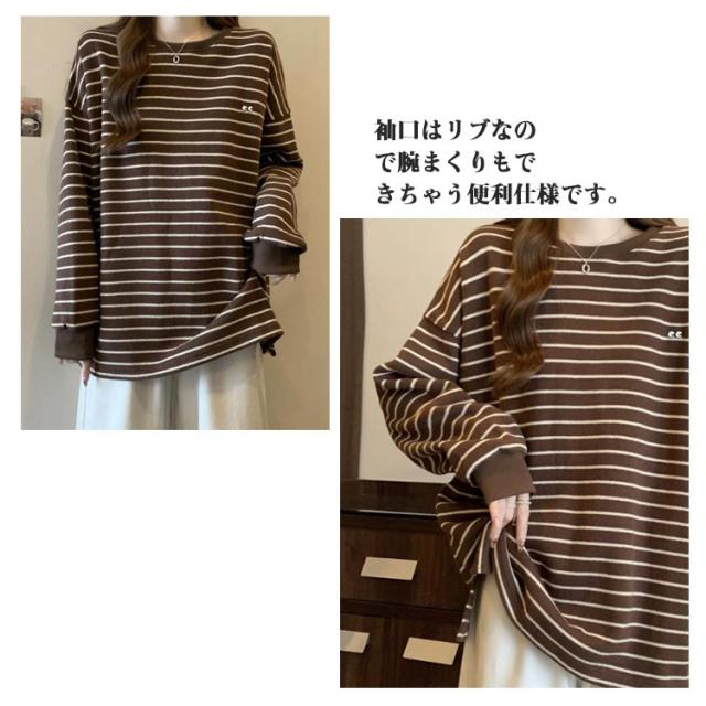 カットソー Tシャツ 長袖 スウェット トレーナー 厚手 レディース ゆったり ロンT トップス ボーダー クルーネック 丸首 刺しゅう スリット ボーダートップス あったか 秋