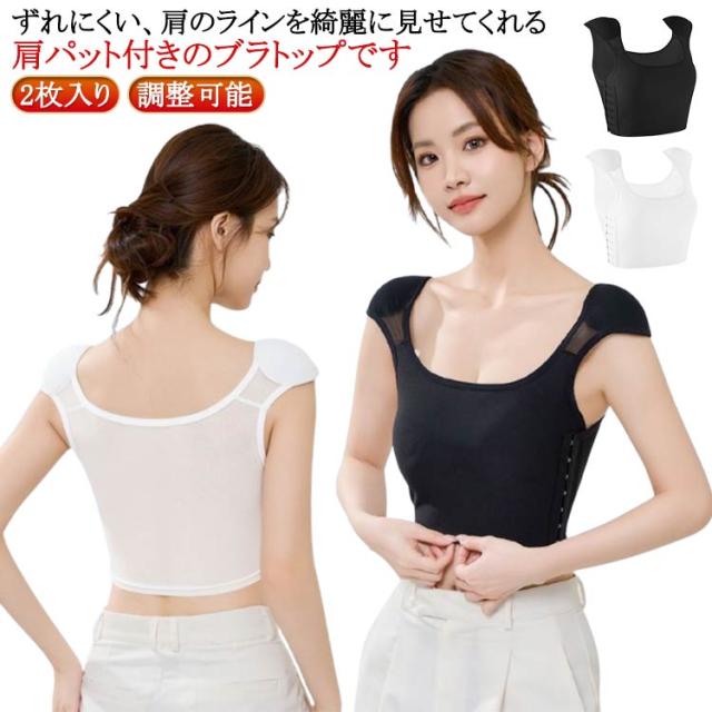 肩パッド付ブラジャー 肩パッド付インナー 2枚入り ブラジャー ブラ 下着 レディース 女性用 フレンチスリーブ 3段フック 調整可能 Uネック 無地 シンプル ストレスフリー 全2色 黒 白 ブラック ホワイト 送料無料
