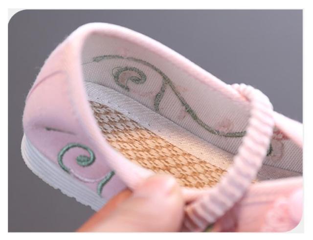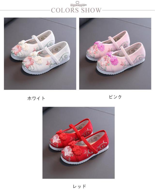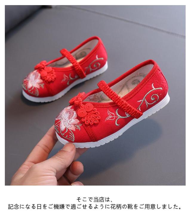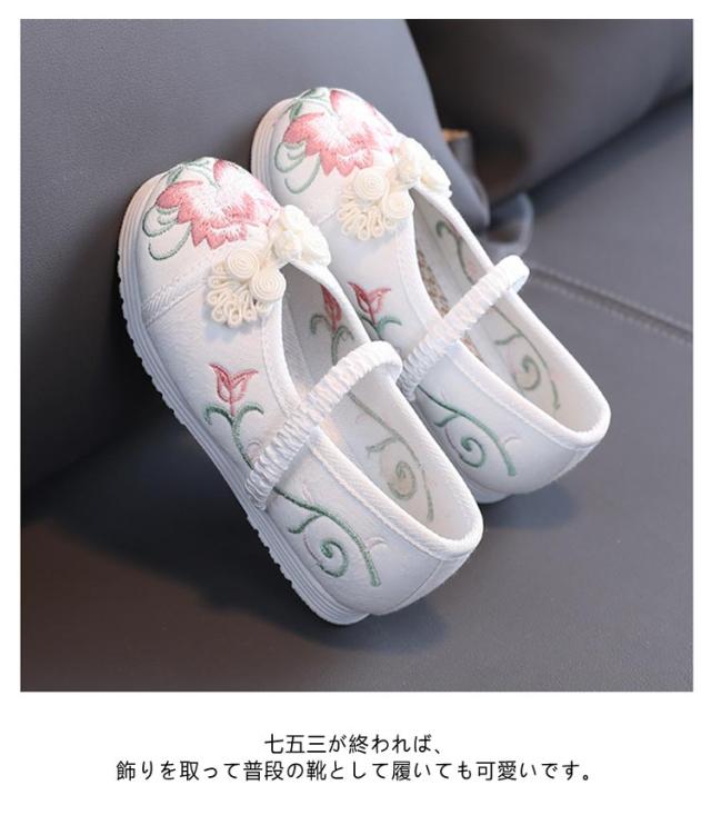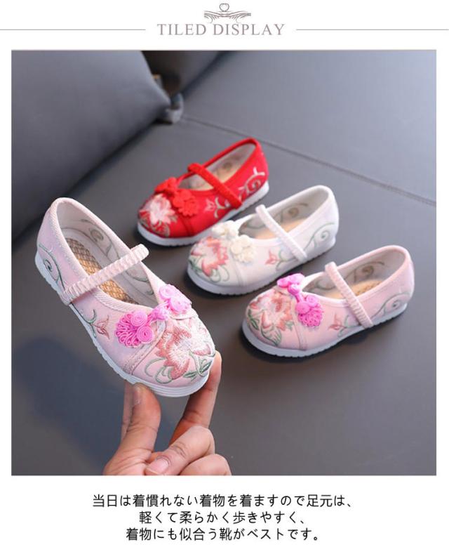 | 刺繍された可愛い靴です。当日は着慣れない着物を着ますので足元は、軽くて柔らかく歩きやすく、着物にも似合う靴がベストです。 七五三の女の子の3歳の時には三つ身の被布着物を着ますが、まだまだ小さいので履きなれない草履を嫌がることもあります。 実際に足袋を履いて、草履を履かせてお出かけすると滑って脱げたり、躓いたり。草履で上手に歩くのはまだちょっと難しいよね、というのが本当のところです。 そこで当店は、記念になる日をご機嫌で過ごせるように花柄の靴をご用意しました。 刺繍がされていて、着物ともなじみやすく、非常に軽くて柔らかい靴ですので、神社など段差の多い場所や砂利道もへっちゃらで機嫌よく歩いてくれますよ。 七五三が終われば、飾りを取って普段の靴として履いても可愛いです。 | |