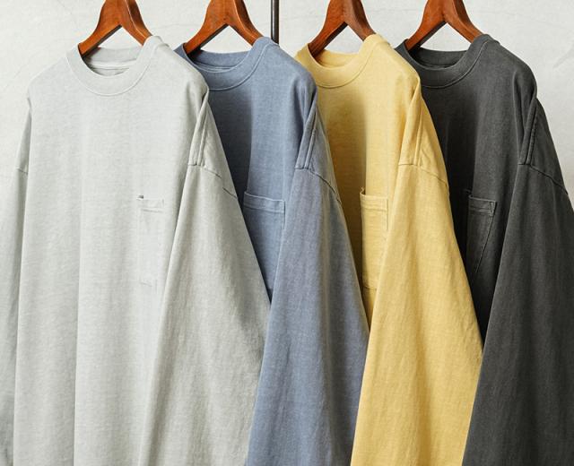 タフな生地感と絶妙な色合いが特徴のガーメントダイポケットTシャツの登場です。アメリカコットン特有のドライ感に肉厚で縫製強度の高いタフなボディ。またガーメントダイを施しているため、着用回数を重ねるほどに体に馴染み、色合いや風合い、雰囲気が増していくので育てる楽しみがある一枚。ゆったりとしたリラックスシルエットに胸ポケットがアクセント。シンプルなデザインながらも肌なじみの良いカラーバリエーションでオールシーズン着用できる優秀アイテムです。