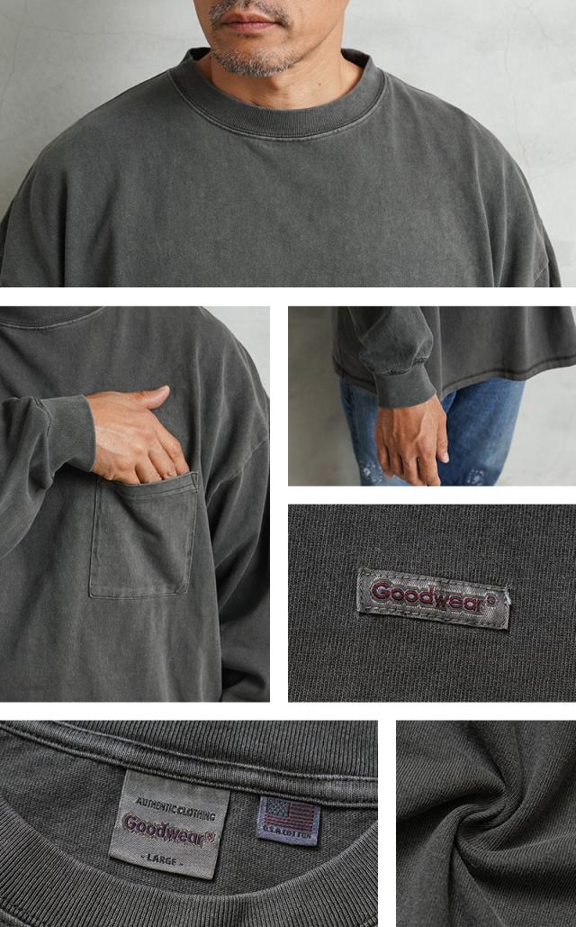Goodwear グッドウェア 2W7-64204 USAコットン L/S ガーメントダイ ポケット Tシャツ SUPER BIG【T】|ポケットTシャツ メンズファッション アメカジ 長袖 厚手 タフ リラックスシルエット 無地 経年変化