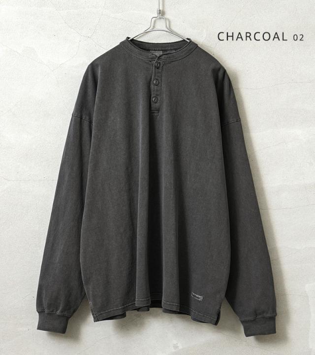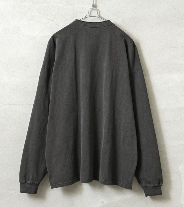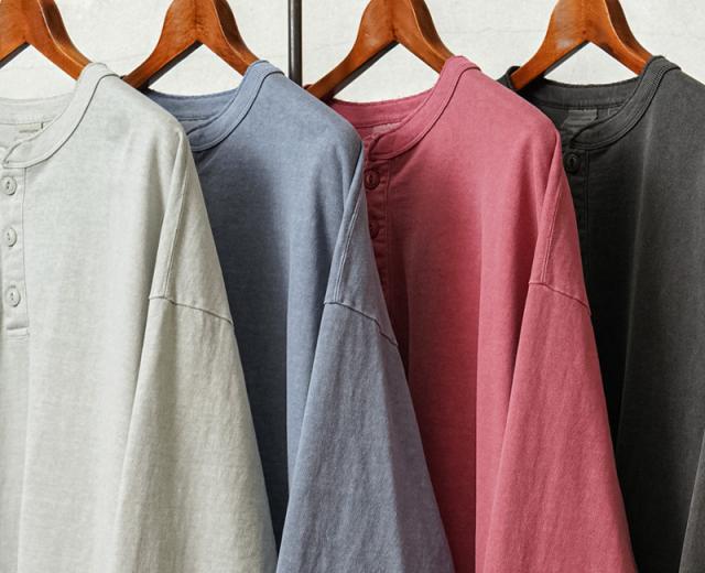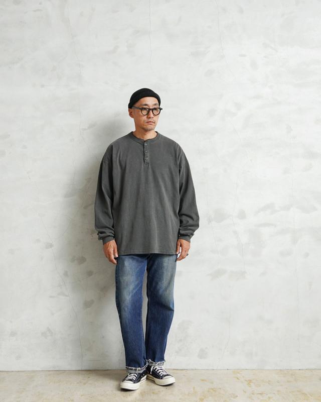 タフな生地感とシンプルなデザインで何度も着たくなる、ヘンリーネックのロングスリーブTシャツの登場です。アメリカコットン特有のドライ感に肉厚で縫製強度の高いタフなボディ。またガーメントダイを施しているため、着用回数を重ねるほどに体に馴染み、色合いや風合い、雰囲気が増していくので育てる楽しみがある一枚。ベーシックなシルエットと、シンプルな猫目ボタンのヘンリーネックデザイン。袖口や襟にリブを配置しているのですっきりとした印象を与えます。