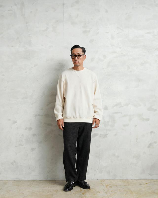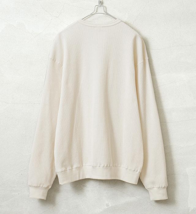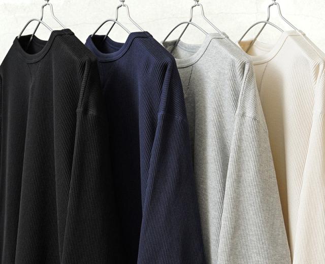 アメリカの老舗アパレルFRUIT OF THE LOOMから、ベーシックなカラーが特徴的なワッフル サーマル スウェットが登場しました。程よい厚みで、ソフトな肌触り100%コットン素材を使用。凸凹とした立体感のあるワッフル生地が通気性と保温性を与えてくれます。ややゆったりめシルエットに、肩の落ちるドロップショルダー。ヴィンテージライクな襟元のV字ガゼットが雰囲気抜群。ベーシックなデザインと実用性でトップス、インナーどちらも快適に過ごせるおすすめアイテムです。