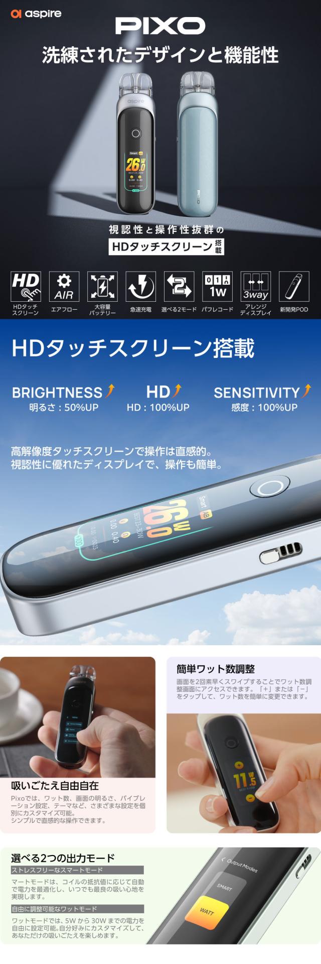 Favostix(ファボスティックス)やGOTEK(ゴーテック)シリーズで大人気の電子タバコブランドAspire(アスパイア)より、HDタッチスクリーンを搭載した革新的なデバイス’’ Pixo (ピクソー)’’の登場です。
